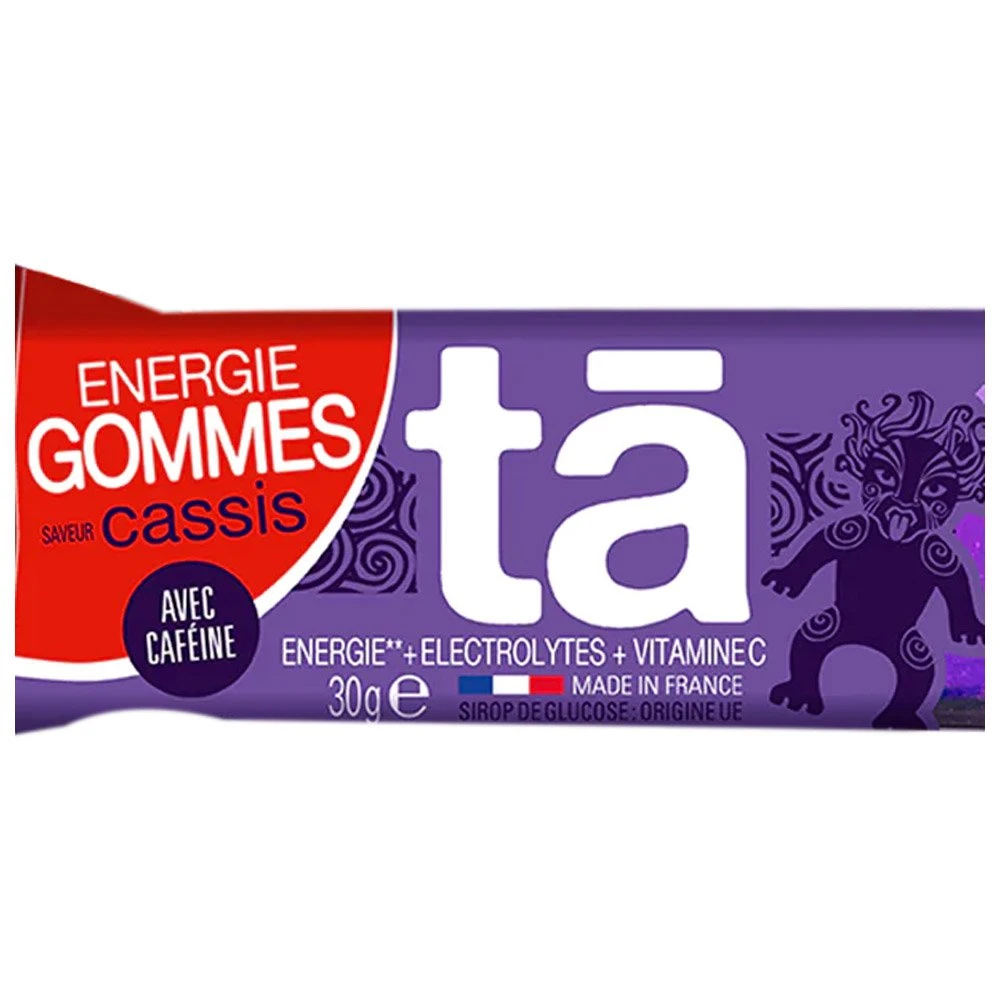 FabriquĂ©es en France, les gommes Ă mĂącher Energy Cassis de la marque TÄ sont une alternative aux gels. Les 3 gommes contenues dans le sachet reprĂ©sentent un apport Ă©nergĂ©tique de 97 calories. Elles se consomment une par une, toutes les 20 minutes lors des phases oĂč les efforts sont les plus intensifs. Elles sont sources de glucides, de vitamine C, de sodium et de potassium. Cette saveur Cassis contient de la cafĂ©ine, rĂ©putĂ©e pour avoir un effet sur la concentration.