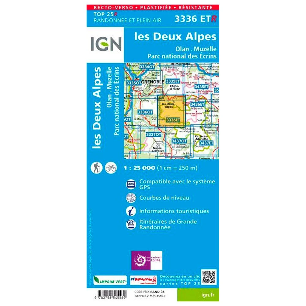 Explorez les Deux Alpes, Olan et Muzelle dans le Parc national des Ecrins avec la carte de randonnée IGN 3336ETR . Cette carte très précise vous offre tous les détails du terrain, des voies de communication aux sentiers, en passant par les constructions et les arbres isolés. Vous trouverez également des informations touristiques et des sentiers balisés pour vous guider.