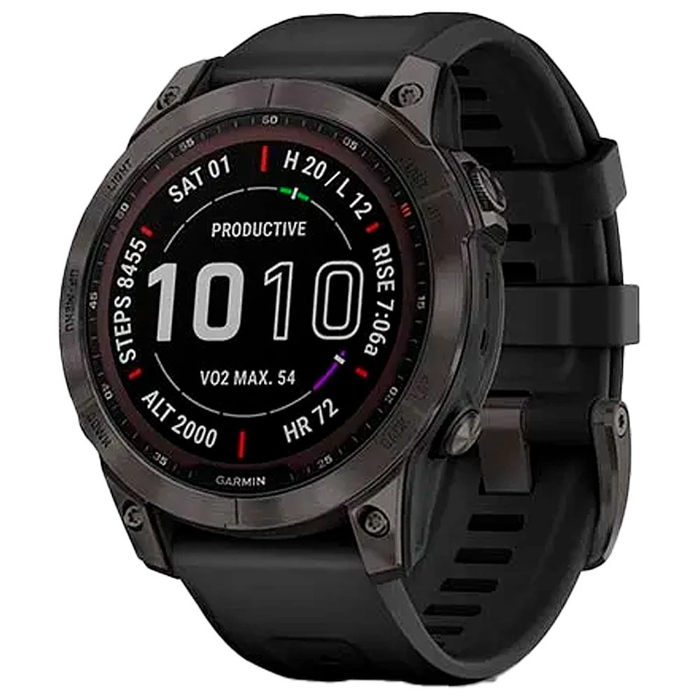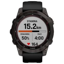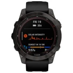 La montre GPS Garmin Fenix 7 Sapphire Solar Edition est un modèle rĂ©sistant aux rayures et Ă la chaleur pouvant ĂŞtre immergĂ© jusqu’à 100 m de profondeur. IdĂ©al pour le quotidien comme pour le sport, elle offre de nombreuses fonctionnalitĂ©s telles que les fonctions classiques d’heure, date, rĂ©veil, chronomètre, minuteur et heures de lever/coucher du soleil. Le GPS bĂ©nĂ©ficie d’une compatibilitĂ© multi GNSS pour de meilleures performances, et les fonctions frĂ©quence cardiaque continue ou au repos ainsi que suivi du stress et de la respiration sont Ă©galement intĂ©grĂ©s. Les Smart Notifications vous permettent de recevoir vos messages, alertes et emails sur la montre.Â