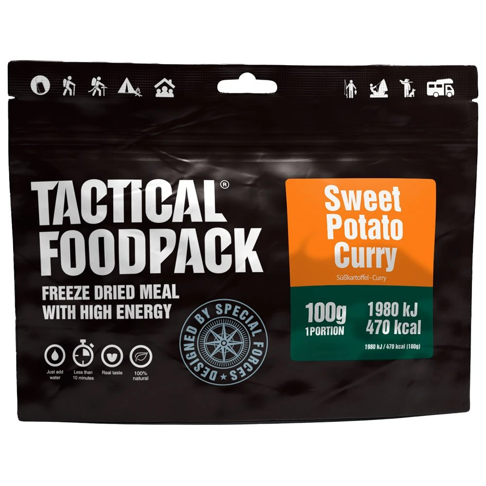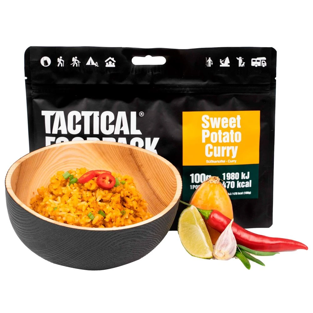 DĂ©gustez le repas lyophilisĂ© Curry de Patate Douce 100g de chez Tactical FoodPack, un mĂ©lange de douceur et d’Ă©pices qui rĂ©veille les papilles. Le lait de coco et le citron vert subliment le curry et sont servis avec du riz moelleux.