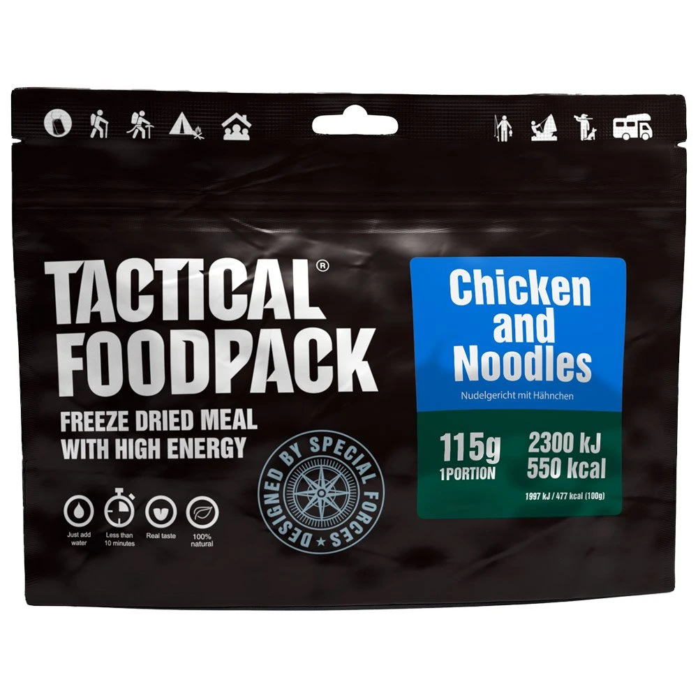 Le Poulet et Nouilles 115g Tactical FoodPack est un repas lyophilisé facile à transporter et à longue conservation. C’est un choix idéal pour une alimentation saine et équilibrée en plein air, préparé avec des ingrédients naturels et sans additifs.