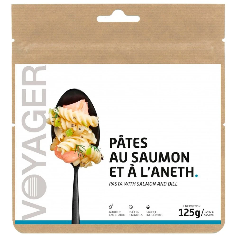Les Pâtes Au Saumon Et à L’aneth sont un classique revisité par Voyager en version plat lyophilisé pour répondre aux attentes des sportifs évoluants en pleine nature : emmener et porter peu de poids, de volume et profiter d’un repas sain, savoureux et consistant pour repartir plein d’énergie. Simple d’utilisation, il suffit de verser 250 ml d’eau chaude dans le sachet. Remuez, patientez quelques minutes et c’est prêt !