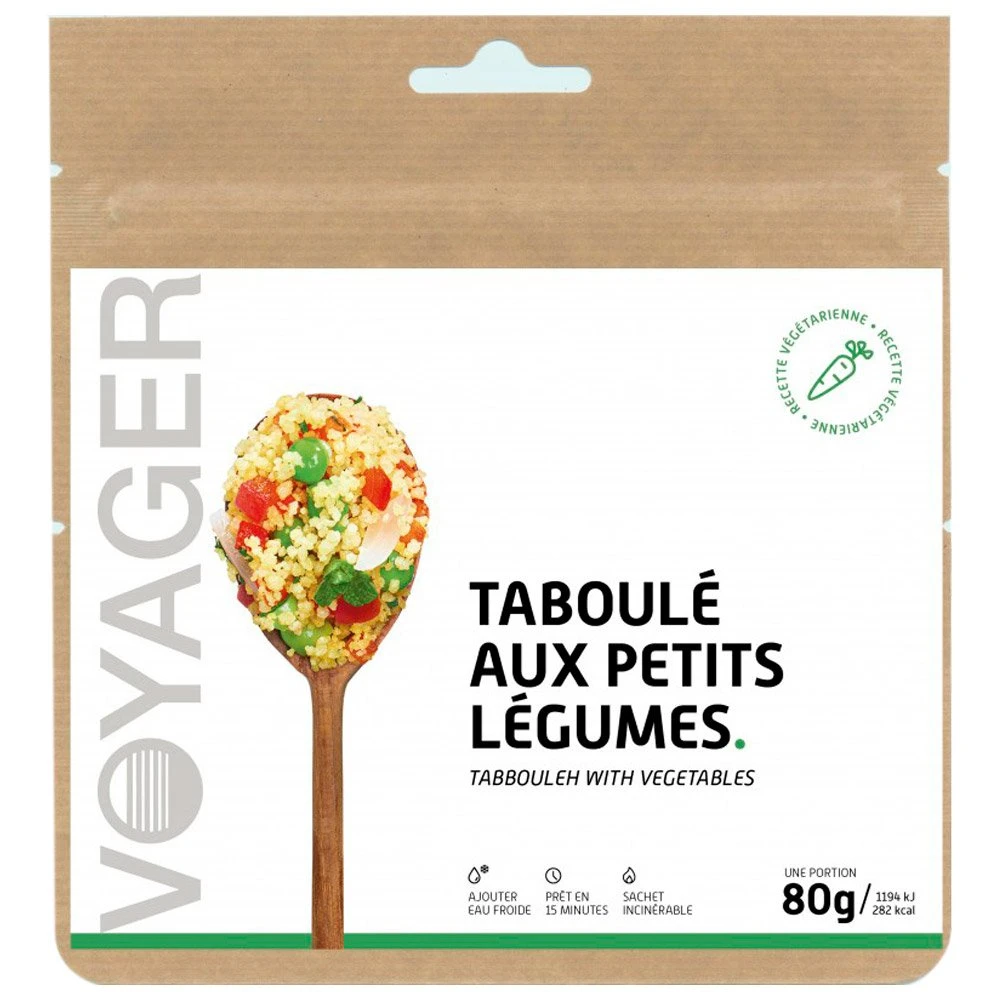 Le Taboulé Aux Petits Légumes de chez Voyager présente l’avantage de se préparer sans avoir besoin de réchaud, en versant de l’eau à l’intérieur du sachet. Ce délicieux plat végétarien offre un apport sain en lipides, glucides et protéines et permet de faire le plein d’énergie.