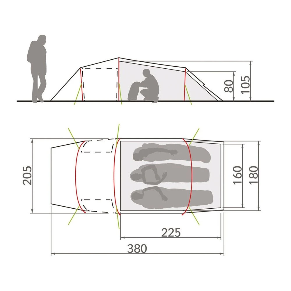 Hauteur de la tente : 105 cm / Largeur : 205 cm / Longueur : 380 cmÂ